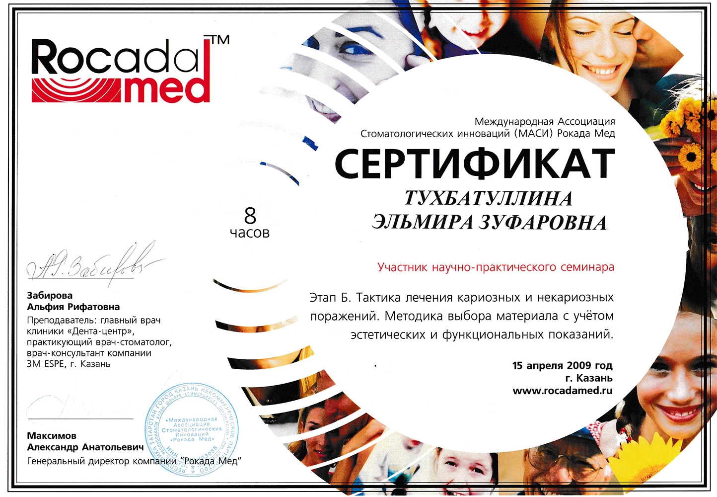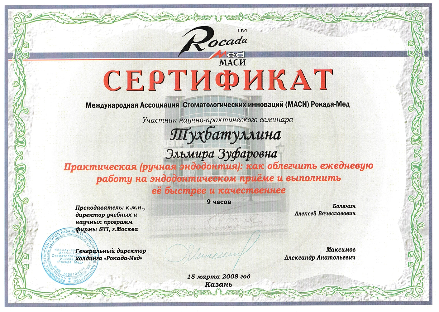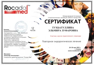 - 2012, Международная ассоциация стоматологических инноваций (МАСИ) Рокада-Мед. Казань. Научно-практический семинар «Повторное эндодонтическое лечение».
