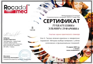 - Федеральное государственное бюджетное образовательное учреждение дополнительного профессионального образования «Российская медицинская академия непрерывного профессионального образования «Министерства здравоохранения Российской Федерации», аккредитация по «Стоматология терапевтическая», №7722 030725290 от 27.07.2022 г.
